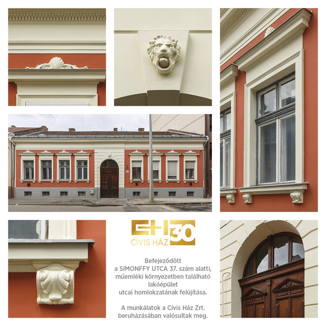 Befejeződött a Simonffy utca 37. szám alatti, műemléki környezetben található lakóépület utcai homlokzatának felújítása. A munkálatok a Cívis Ház Zrt. beruházásában valósultak meg.