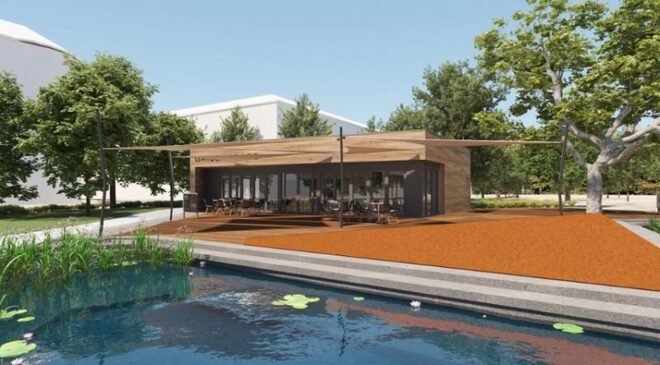 A jelenleg kivitelezés alatt álló, mindösszesen bruttó 179 m2 alapterületű (161 m2 pavilon+18 m2 fedett terasz) pavilon építmény melegkonyhás vendéglátó tevékenység végzésére lesz alkalmas.