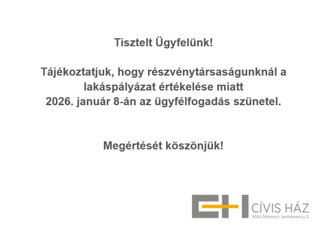 Tájékoztatjuk, hogy részvénytársaságunknál a lakáspályázat értékelése miatt 2026. január 8-án az ügyfélfogadás szünetel.