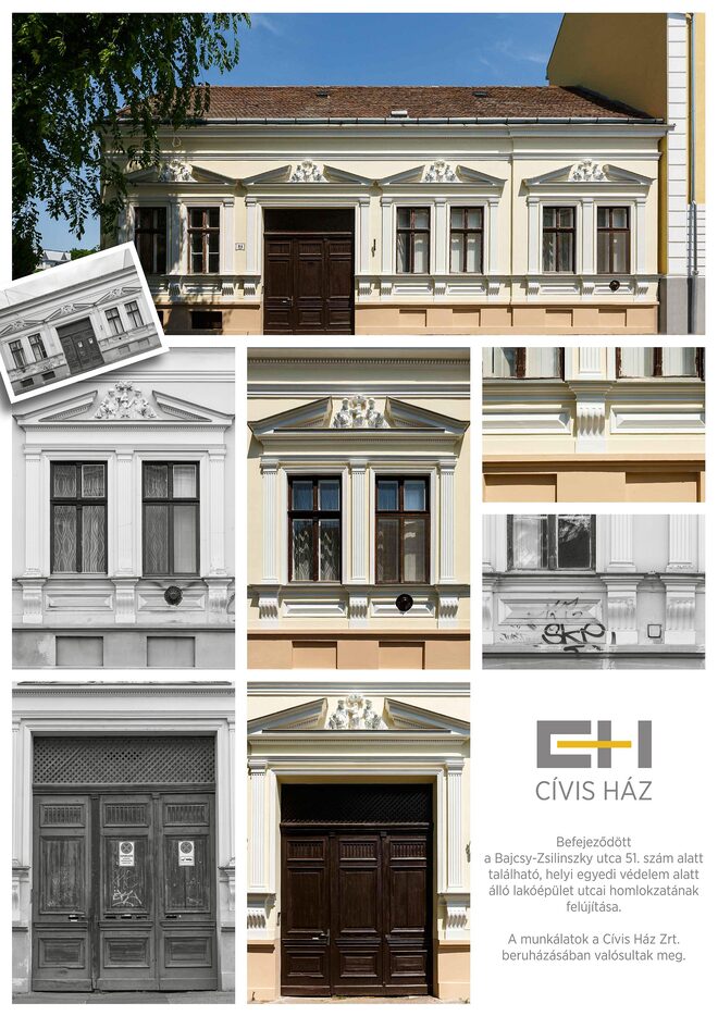 Befejeződött a Bajcsy-Zsilinszky u. 51. sz. alatt található, helyi egyedi védelem alatt álló lakóépület utcai homlokzatának felújítása. A munkálatok a Cívis Ház Zrt. beruházásában valósultak meg.
